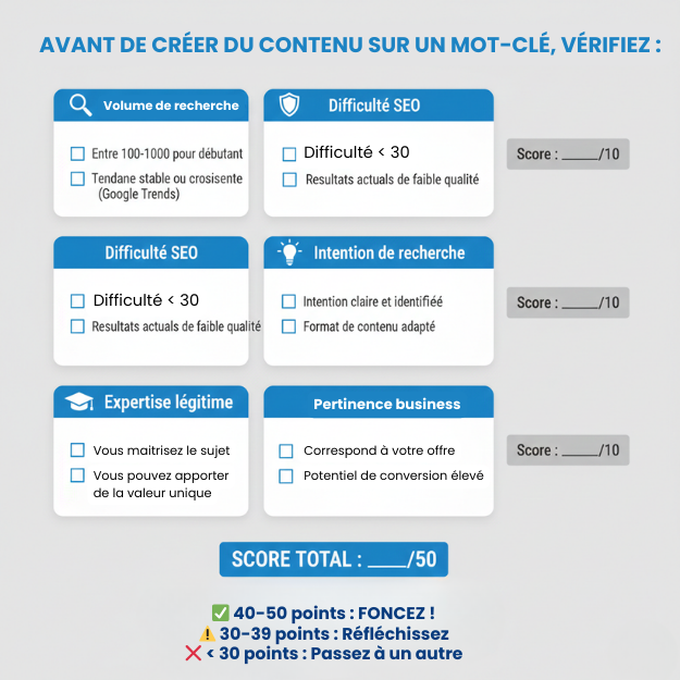 Mon conseil pratique : Créez un tableau Excel simple avec 5 colonnes : Mot-clé | Volume | Difficulté | Intention | Priorité. Classez par priorité et choisissez vos 10 premiers sujets. C’est votre plan d’attaque pour les 3 prochains mois.
